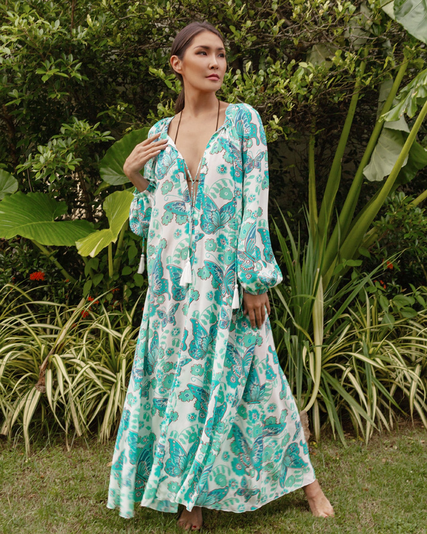 Calista Silk Caftan Maxi Dress - Turquoise Butterfly | Hand-Crafted Silk Crepe